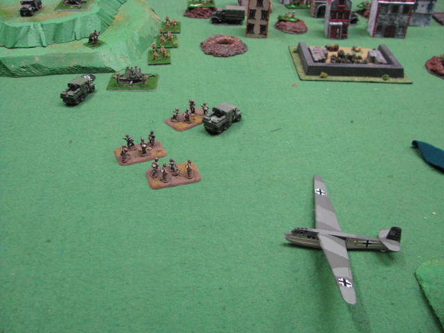 The para drop and glider landing seemed to go reasonably well, though not perfect. It was noted that one glider crashed and was a total loss. Otherwise the weapon canisters and sticks of Falschirmjagers landed on target and the table was soon swarming with Germans. The massive bomb craters were treated as permanent "bullet-proof" cover. Moving out of them did not remove them from play. The buildings were also supposed to be ruins, but they weren't done in time despite a group effort.